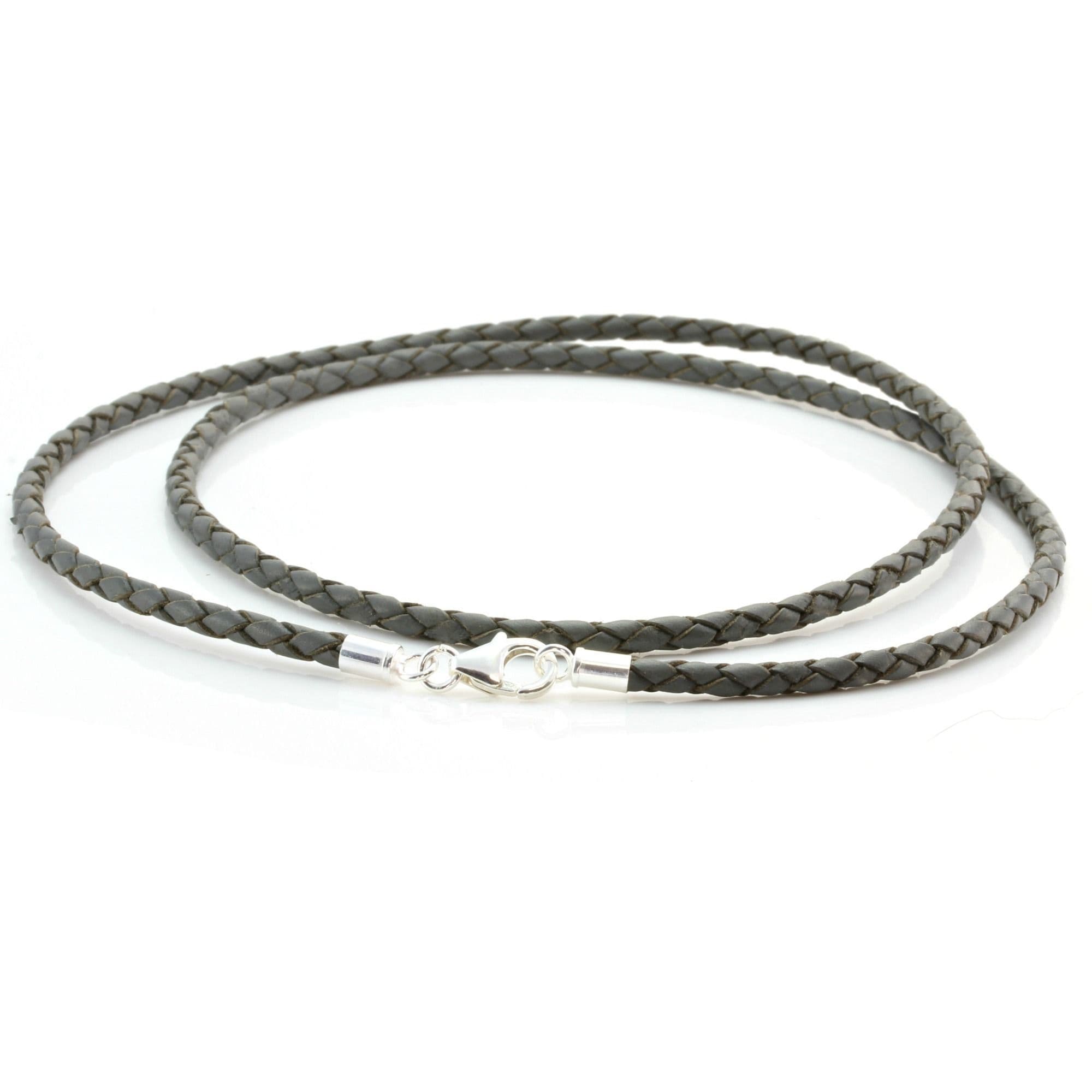 3mm Braided Leather Necklace With Sterling Silver Clasp-Grey