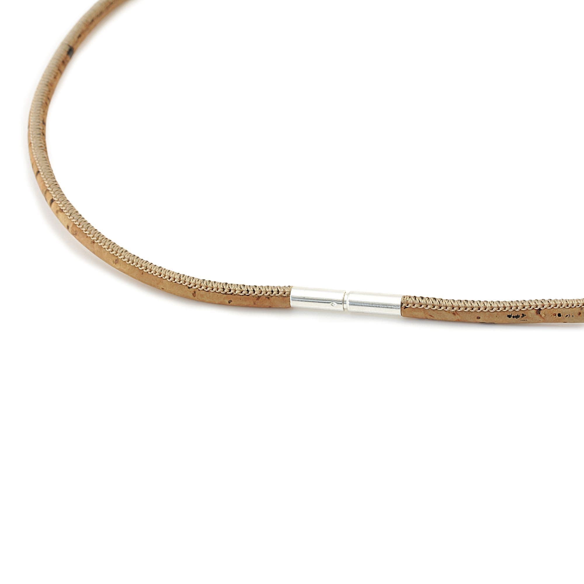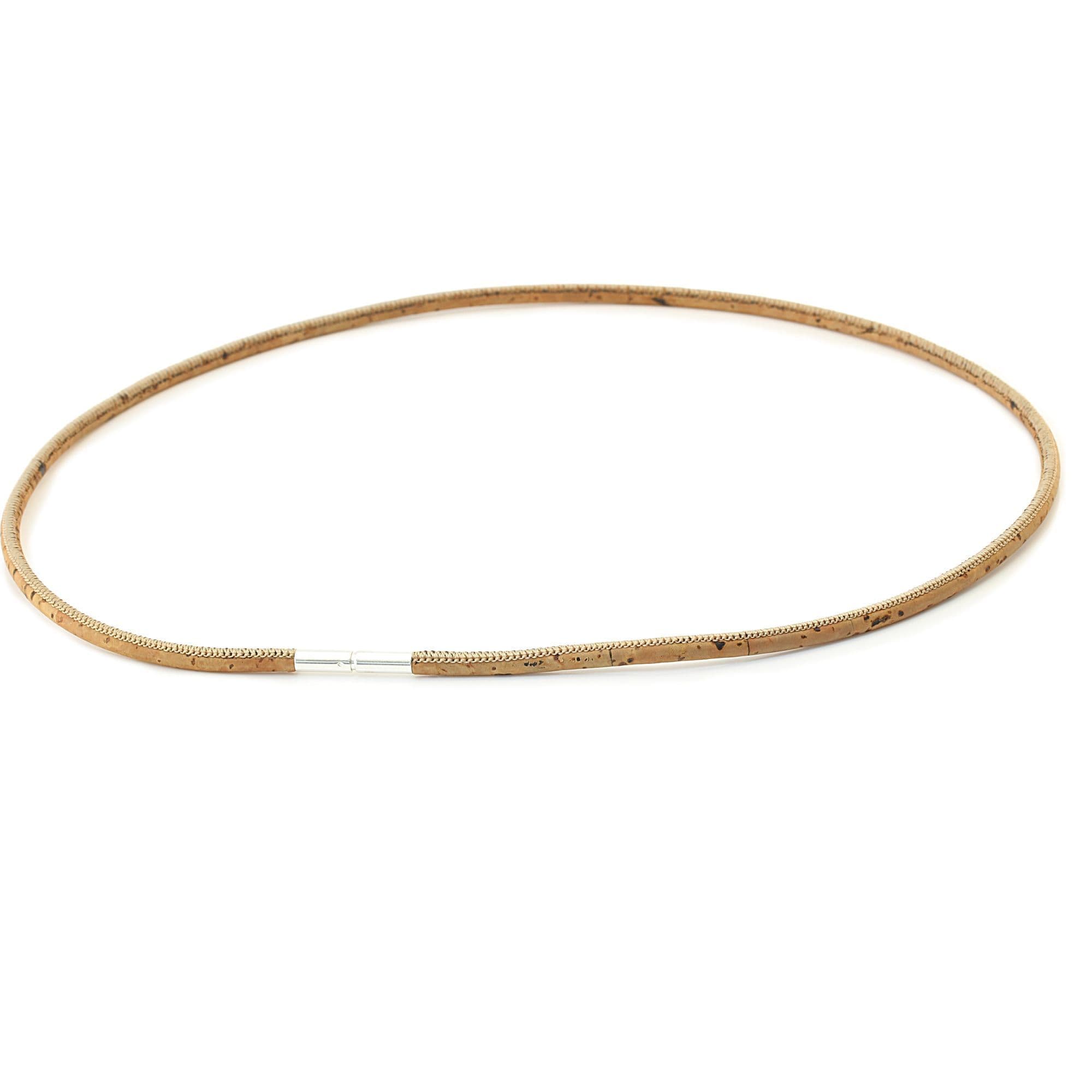 This refined natural-tone cork necklace brings understated elegance to any outfit. The unique grain and texture of the cork make every piece truly one of a kind.