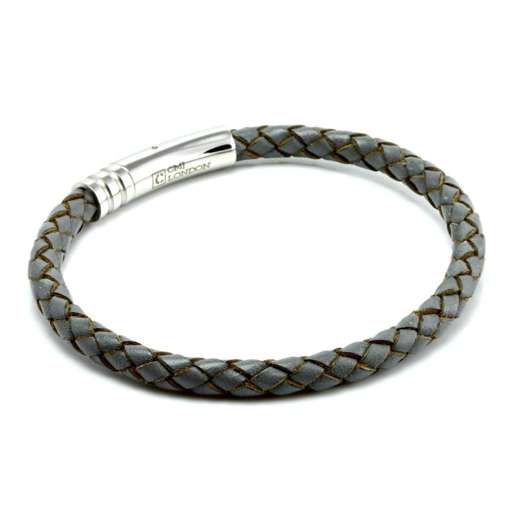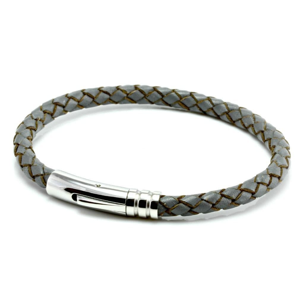Grey Braided Leather Bracelet With Stainless Steel Trigger Clasp